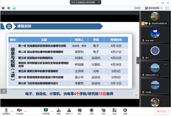 副院长姚如贵教授对该课程的整体安排进行了介绍。该课程是一门交叉性高、挑战度高的精品基础交叉前沿课程,强化应用牵引,注重学科交叉,以信息处理与智能控制问题为主线,由动漫在线
