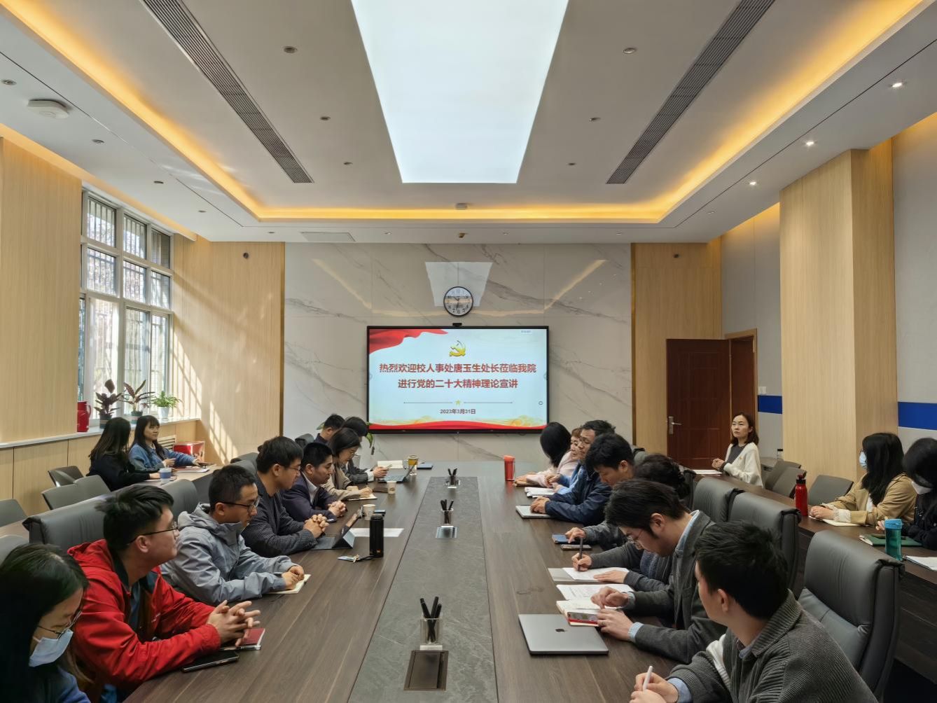 深入学习贯彻习近平新时代中国特色社会主义思想和党的二十大精神,3月31日上午,动漫在线 邀请学校党的二十大精神宣讲团成员、人事处处长唐玉生来到学院,以“深入学习领会党的二十大精神,扎实推进学校人才工作高质量发展”为题,进行党的二十大精神学习宣讲。本次宣讲活动在学院楼119会议室举行,由学院党委书记侯俊主持。学院副书记高敏、副院长姚如贵、副院长高永胜以及党委理论学习中心组成员、各教师支部委员、学院办公室人员参加了宣讲会。