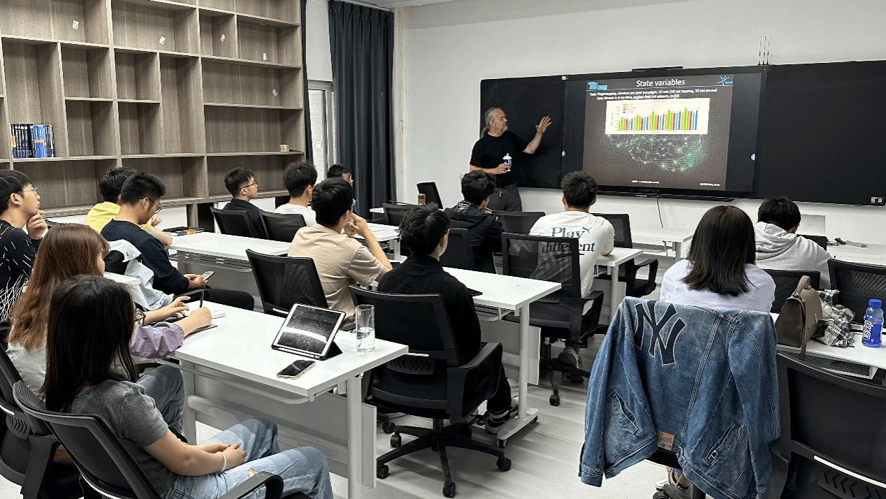 接着,Michael Scholz研究员从经颅电刺激(tECS)的基本概念出发,详细介绍了其团队结合患者特定的脑状态和实时反馈设计的闭环刺激方案,以此为基础着重介绍了一种短时刺激和测量方案,发现即使极短的刺激也能产生可测效果。Michael Scholz 研究员的报告,案例详实、理论丰富、内容前沿,与会师生受益良多。报告结束后,Michael Scholz 研究员与学院师生进行了充分的互动交流,详细解答了师生相关疑问。