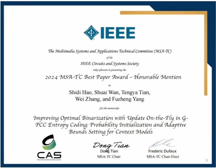 教授万帅指导,硕士研究生郝诗迪等人完成的2篇论文在会议期间作口头报告。其中,由郝诗迪同学为第一作者的论文《Improving Optimal Binarization with Update On-the-Fly in G-PCC Entropy Coding: Probability Initialization and Adaptive Bounds Setting for Context Models》获IEEE MSA-TC 2024 (IEEE电路与系统学会多媒体系统与应用技术委员会)最佳论文荣誉提名奖。