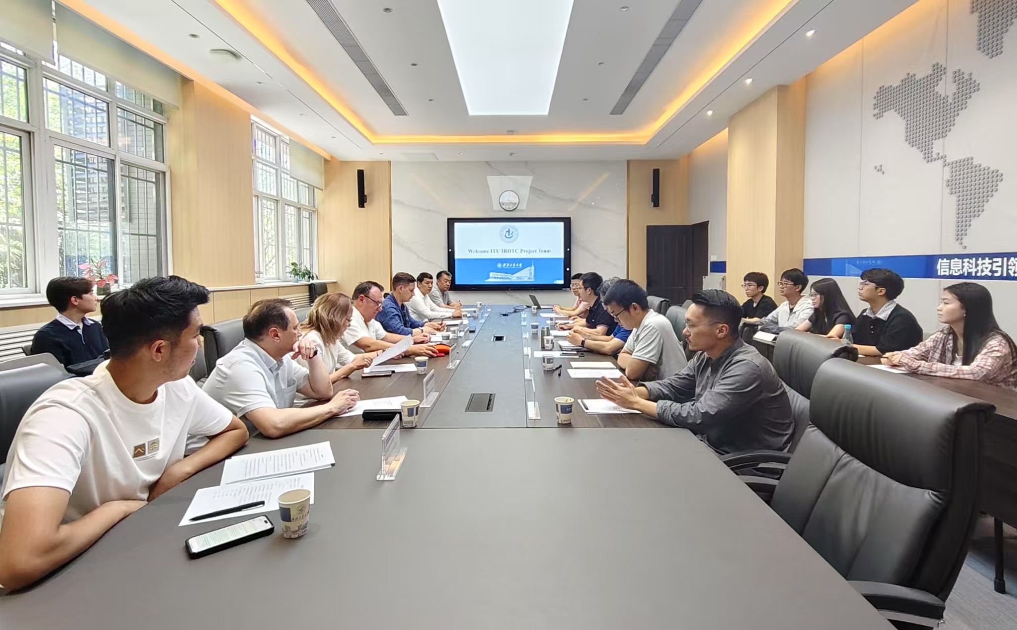 宣传片,直观了解学校的整体情况、办学特色和科研实力。在技术交流环节,国际电信联盟项目团队详细介绍了研究领域及团队成员国高校的情况。我院教师代表张若南、李波、刘自成、杨光伟及刘皓辰分别介绍了研究方向、技术优势与最新进展。双方随后围绕相关的技术领域展开热烈讨论,深入探讨了潜在的合作方向与可能性。