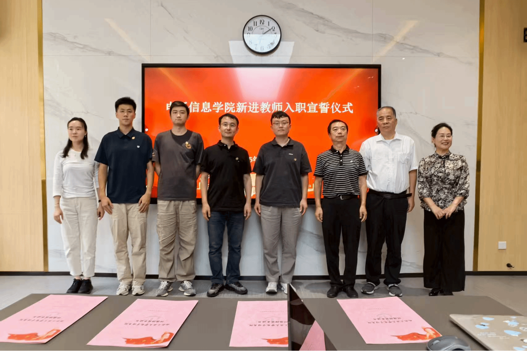 在新进教师入职宣誓仪式上,青年教师高举右拳,庄严承诺将忠诚于教育事业,履行教师职责。侯俊针对习近平总书记关于教育的重要论述、《新时代高校教师职业行为十项准则》和《研究生导师指导行为准则》等内容进行宣讲,强调了师德师风的重要性,希望新进教师们能够坚守教育初心,牢记育人使命。随后,新进教师签订了《师德师风承诺书》,并由院领导和荣休教师为他们佩戴校徽。