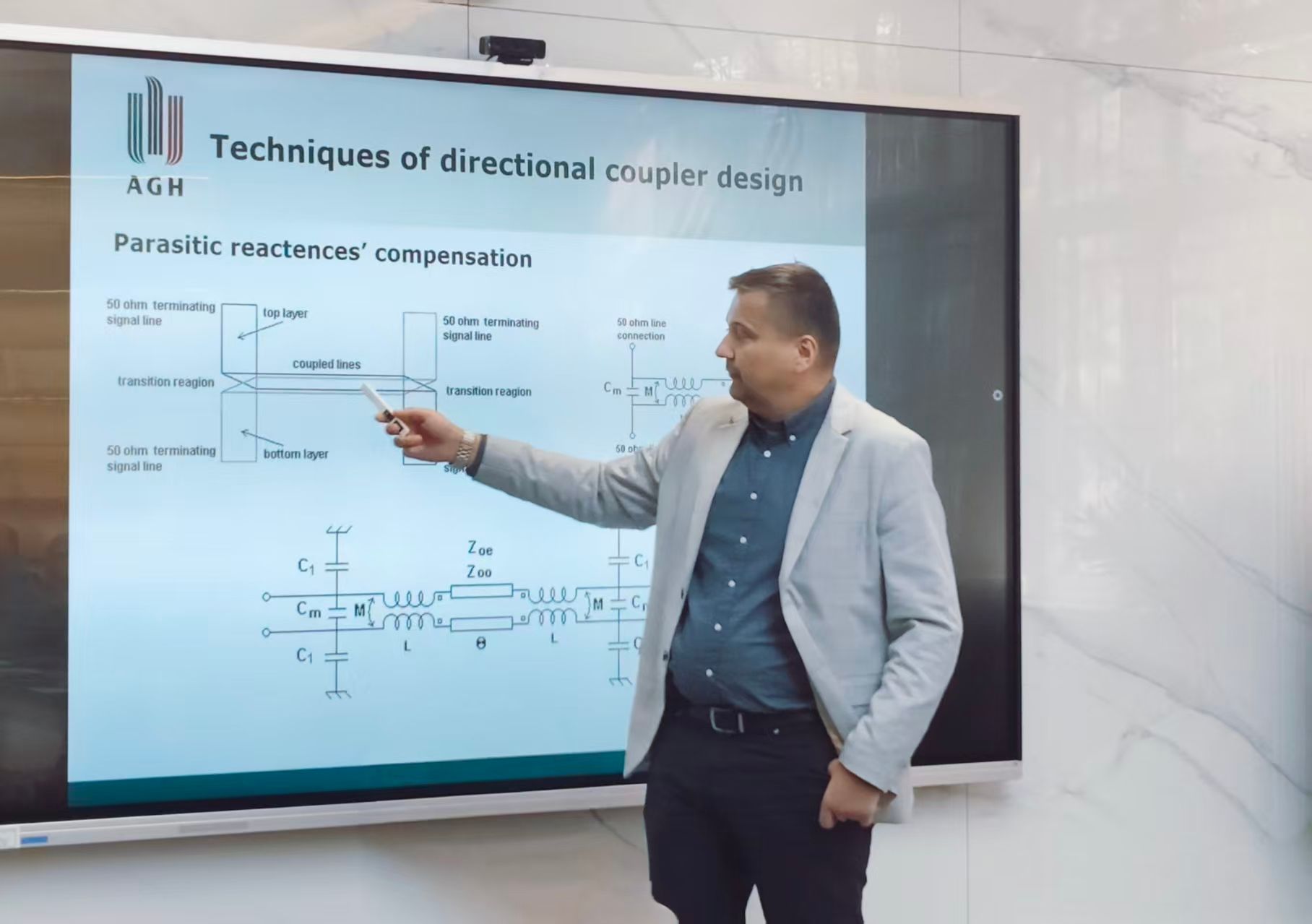 在首场报告中,Slawomir Gruszczynski教授以“微波定向耦合器设计”为题,系统介绍了耦合线定向耦合器的基本原理与性能优化方法。他重点讲解了电容补偿技术在提升耦合器参数方面的应用,并展示了一系列创新设计,包括采用单一耦合系数的级联结构、结合耦合与非耦合段的宽带增强方案,以及阻抗变换定向耦合器在通道放大器中的具体应用。