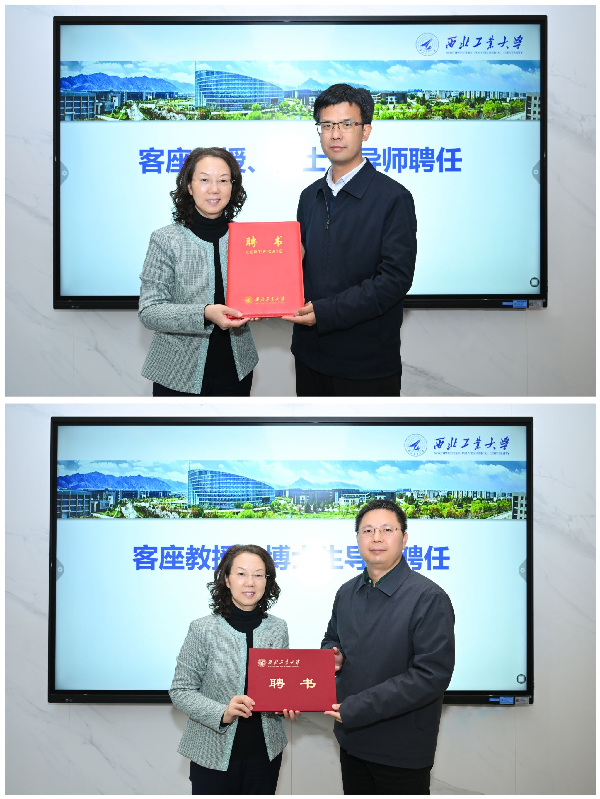 聘任仪式上,张富利为赵春玲颁发客座教授聘书、张洵颖为赵春玲颁发博士生导师聘书。