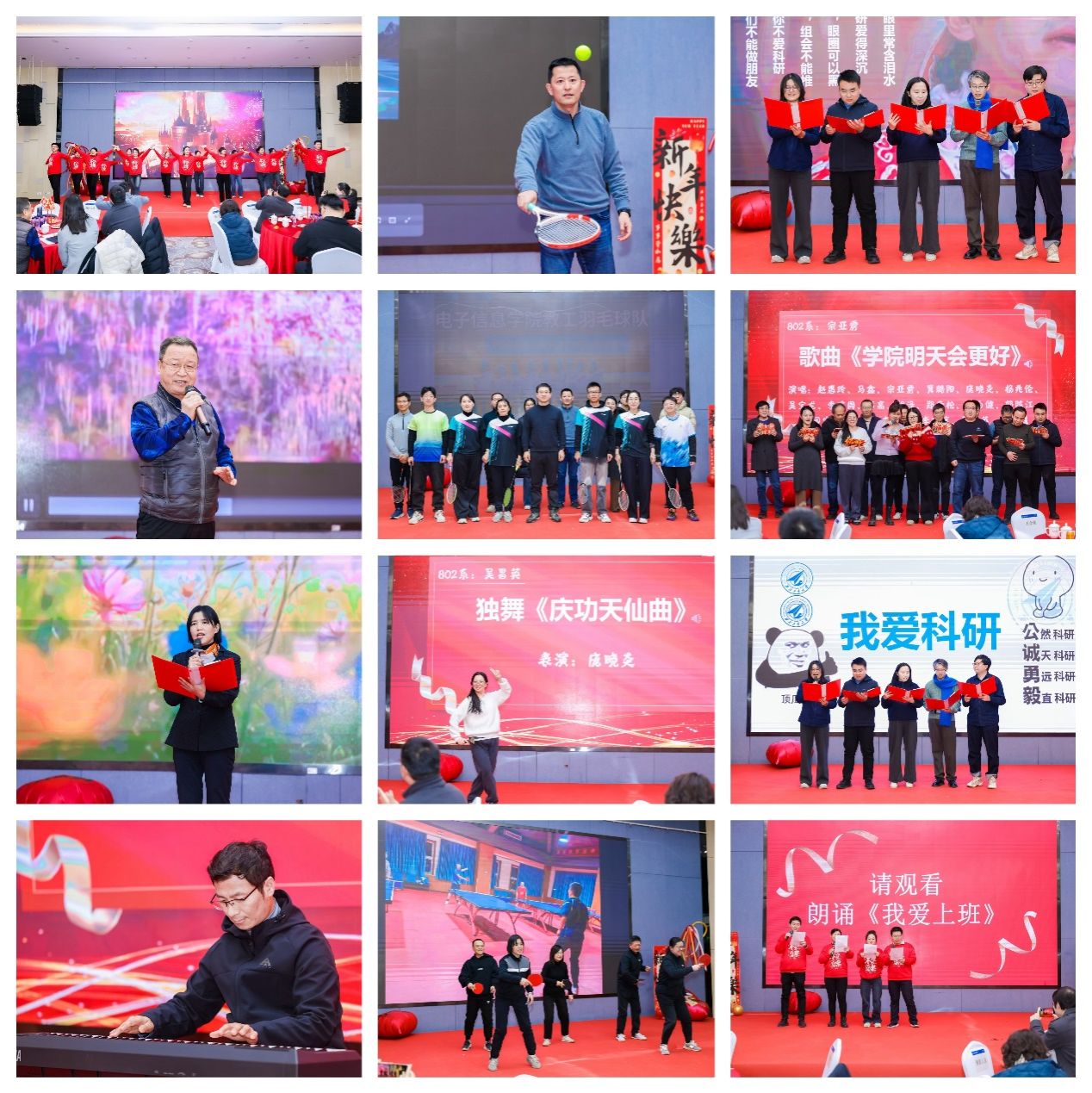 本次联欢会节目形式丰富多样,既有活力满满的舞蹈《逐光而行》、还有国家级教学名师段哲民带来深情悠扬的歌曲《走上高高的兴安岭》,更有触动人心的朗诵《悄悄你已至中年》《我爱上班》《我爱科研》、精彩的钢琴独奏《梦中的婚礼》、趣味乒乓球操与独特的网球文化展示,为现场带来了一场视听盛宴。魔术《送福》以巧妙的手法传递新春祝福,独舞《庆功天仙曲》则用优美的舞姿展现传统文化的魅力。