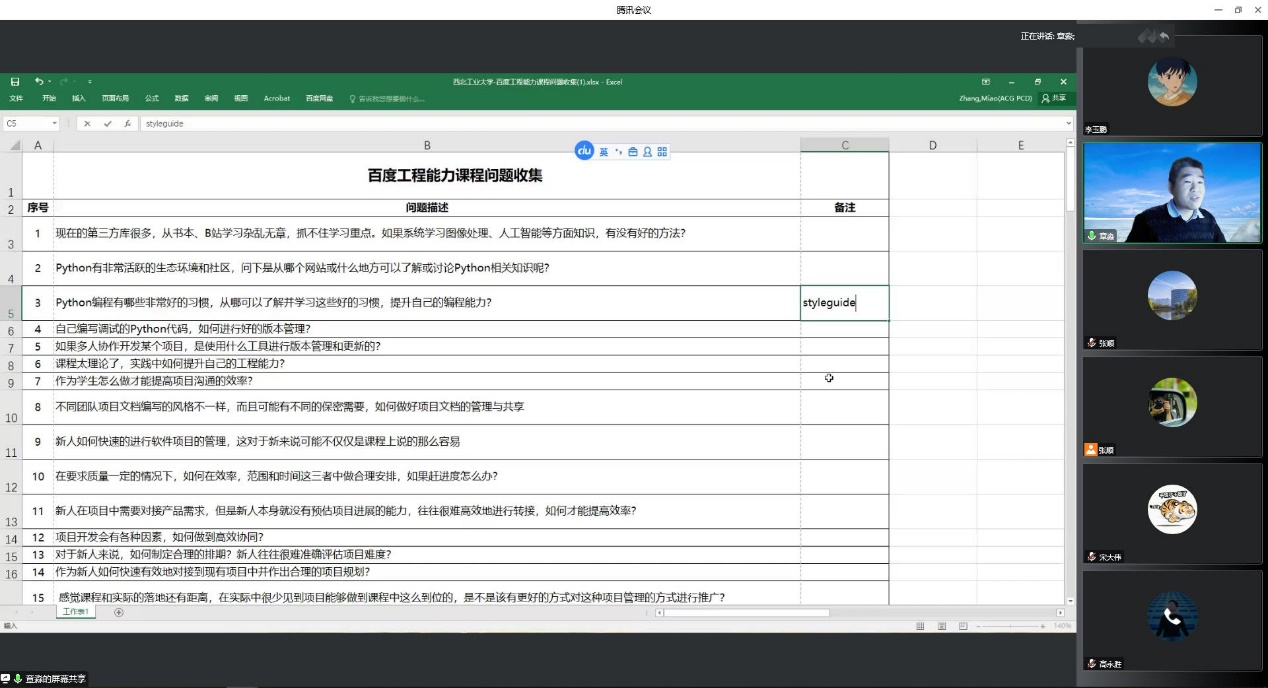11月5日晚,在《Python程序设计》课堂,百度金牌讲师、百度智能云资深研发工程师章淼博士就专业能力提升、未来行业发展、学生职业发展规划等相关问题进行了在线授课和答疑,70多名学生参与聆听。动漫在线