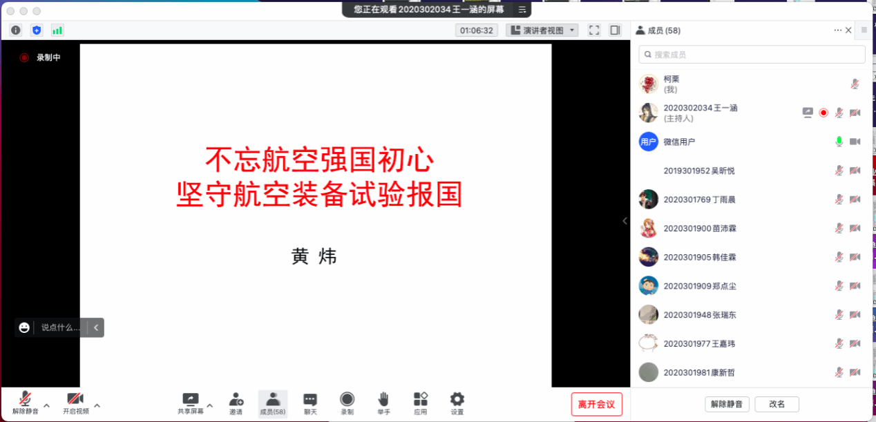 黄炜对航空装备试验、试验鉴定及条件建设领域的人才要求、能力培养等方面进行了介绍,并对航空报国的精神内涵进行了重点讲述。他结合自身工作经历,鼓励同学们在实践中锻炼自己,努力成为综合能力强、知识面广、勤于动手、善于表达和总结的人才,向“干惊天动地事,做隐姓埋名人”的前辈校友们学习,投身祖国航空科技的发展中,为航空强国贡献自己的力量。