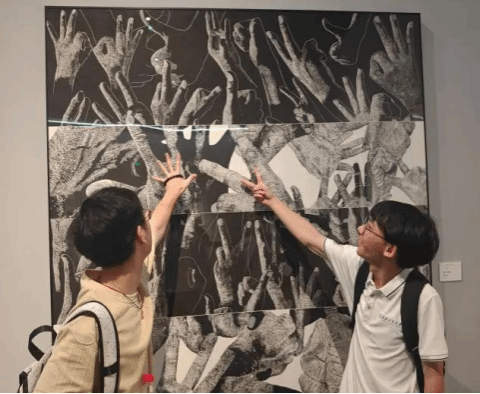 随后,实践队伍来到建国75周年版画展的现场,这场展览汇聚了来自五湖四海的艺术家们对祖国的献礼,每一幅作品都蕴含着艺术家们对这片土地的热爱与深情,传达出积极向上、奋发向前的时代风貌。